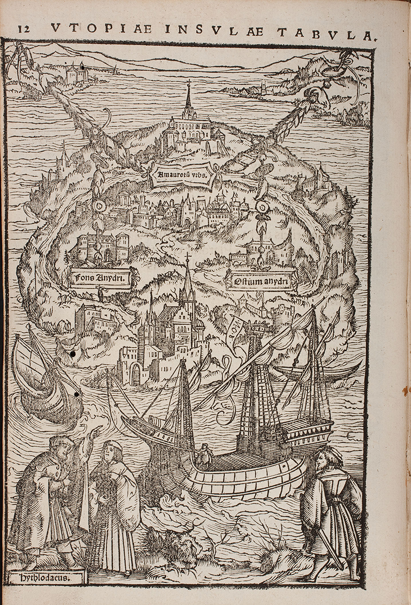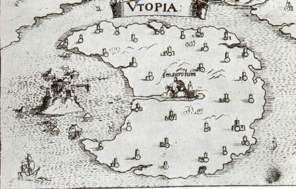 Tamoe. Hay dieciséis ciudades en la isla. La capital, también llamada Tamoe, […] está construida según un plano simétrico y su forma es la de un círculo perfecto […]. Todas las calles son rectas […]. Todas las casas están construidas según el mismo modelo […].